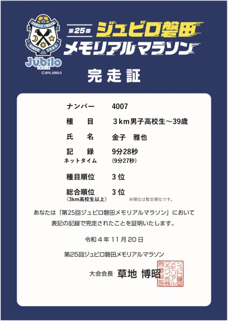 3km男子高校生~39歳の部に出場し、9分28秒で3位でした。